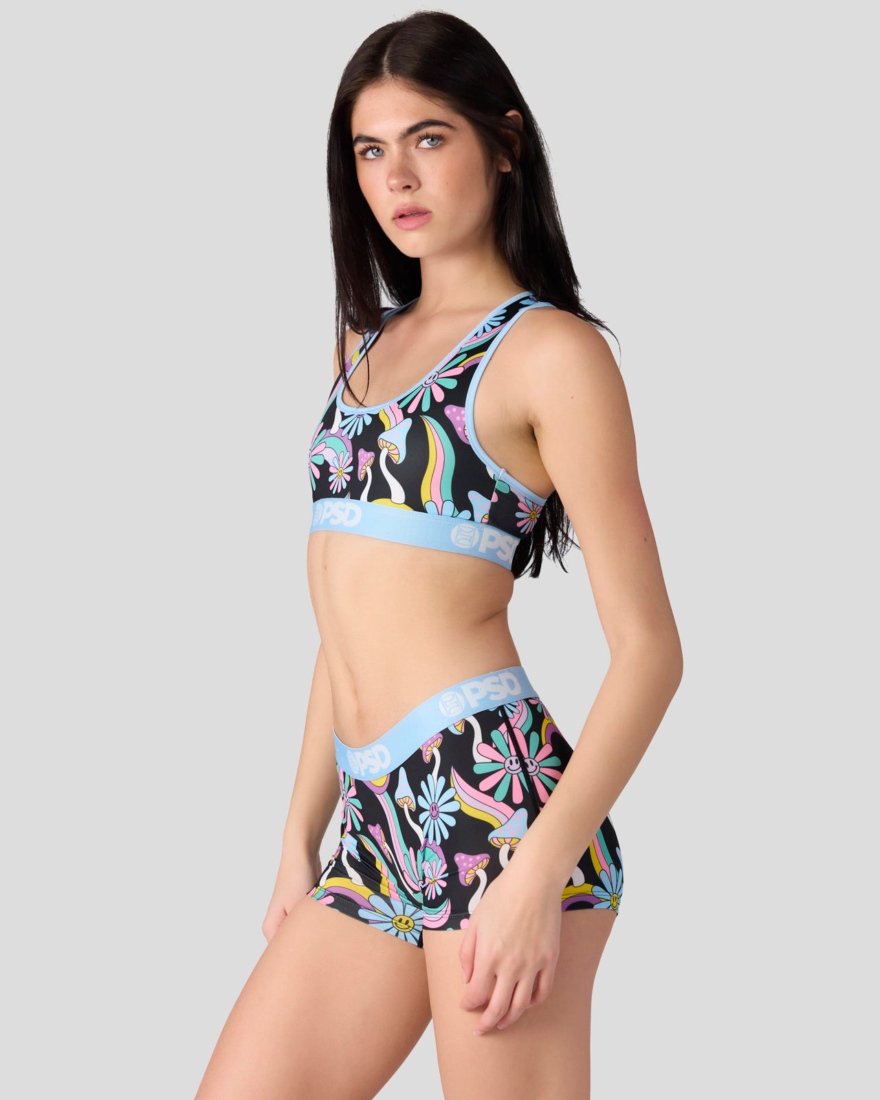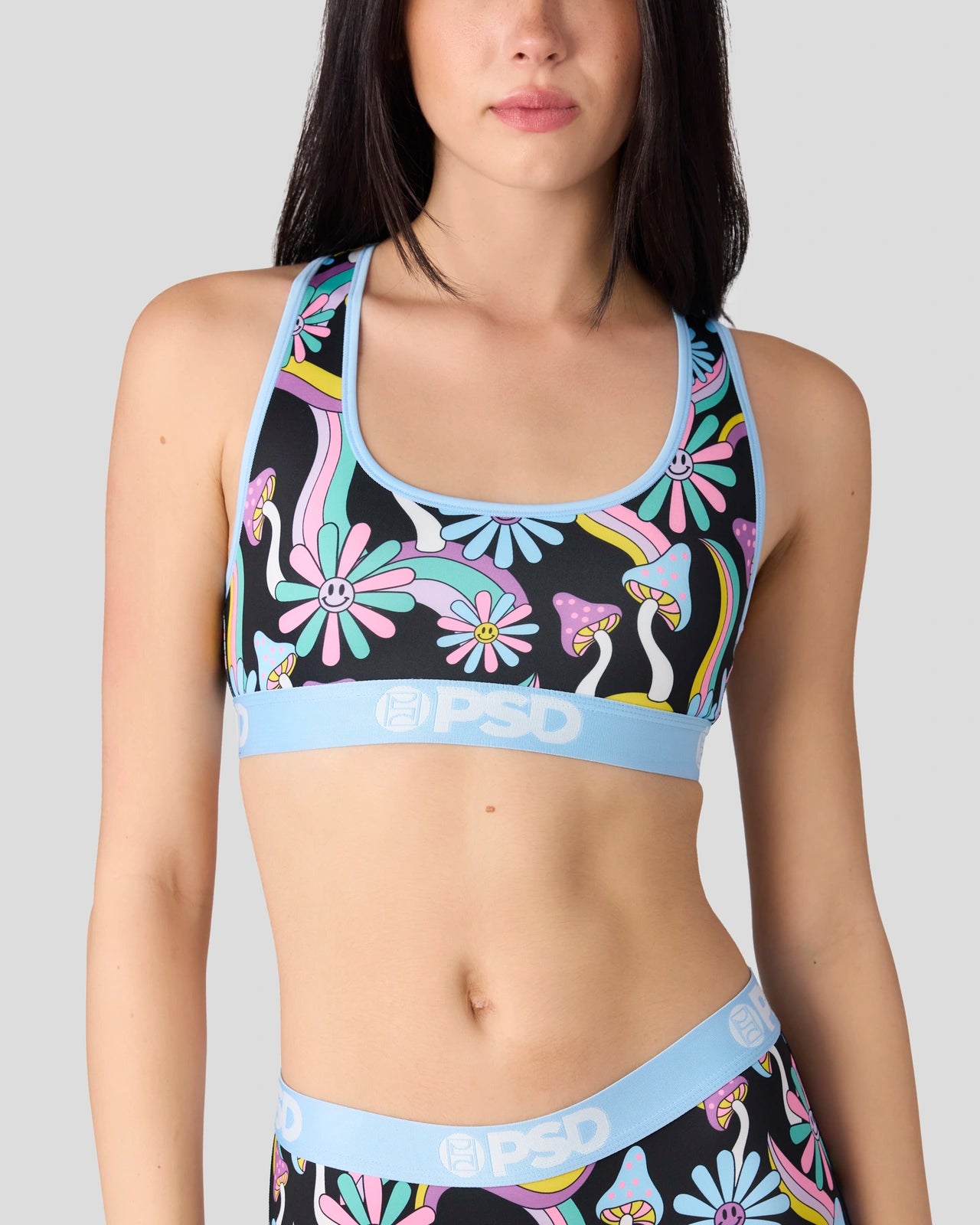 Ready to take a trip? The Happy Shrooms Sports Bra is made from a silky poly blend that???s breathable yet slightly compressive, bringing you the comfort and support you need for everything you get into.