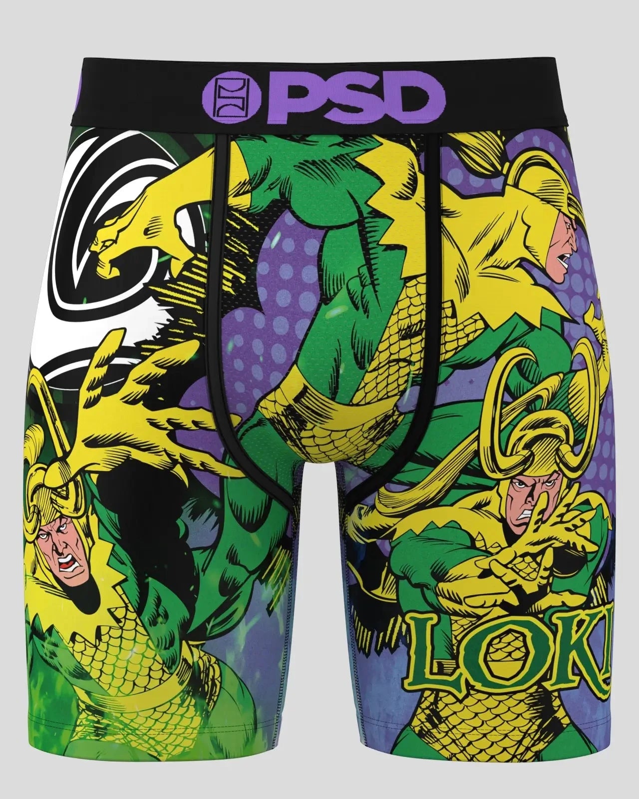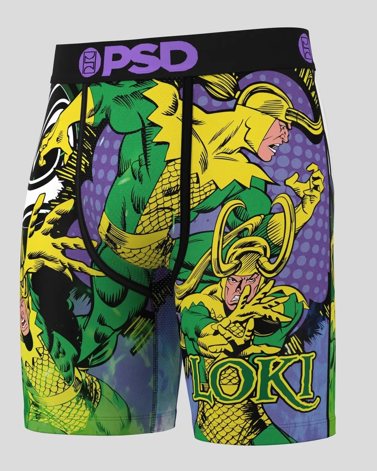 This new look from Marvel features the God of Mischief himself. The Loki briefs include our ultra-comfortable Signature WaistBand, a breathable MicroMesh pouch, and four-way stretch. The PSD 7??? Standard Length Briefs won’t roll or ride and were built for everything, from everyday wear to your toughest workouts.
