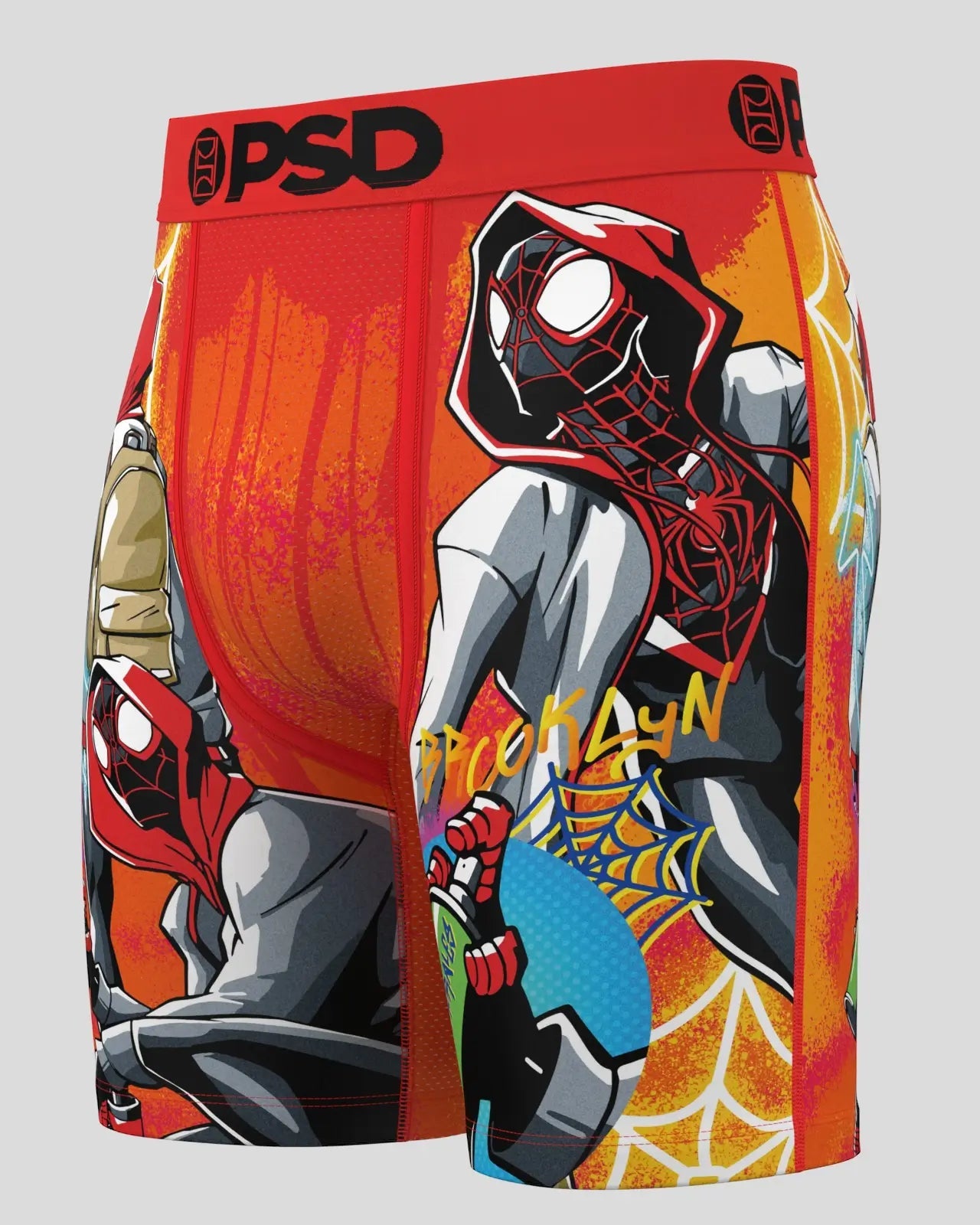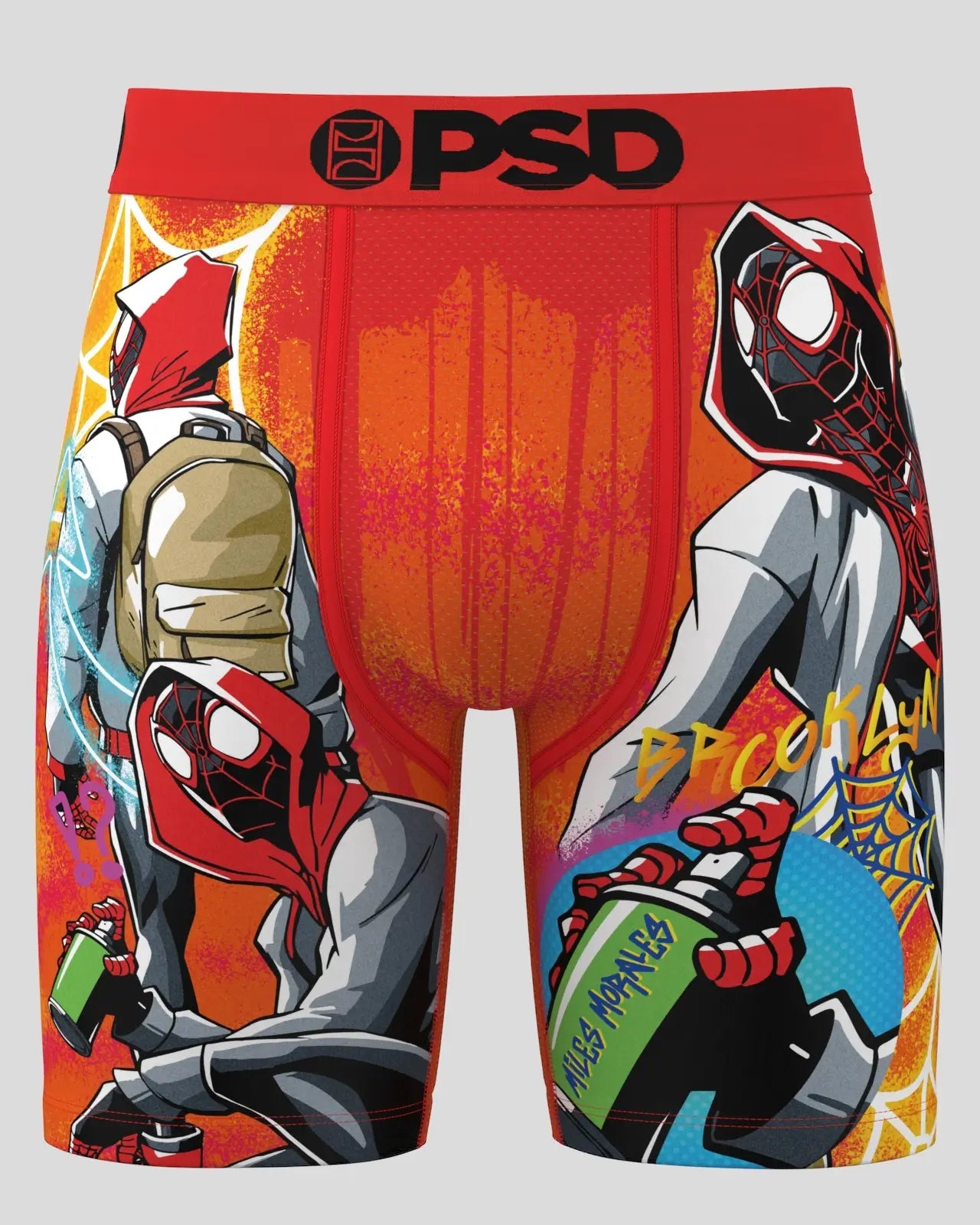 Don???t miss this new look featuring Brooklyn???s own webbed super hero. The Miles Morales Pop briefs include our ultra-comfortable Signature WaistBand, a breathable MicroMesh pouch, and four-way stretch. The PSD 7??? Standard Length Briefs won???t roll or ride and were built for everything, from everyday wear to your toughest workouts.