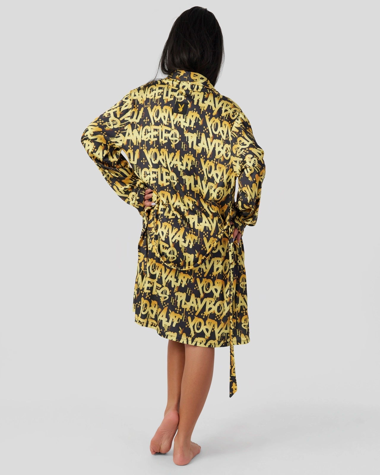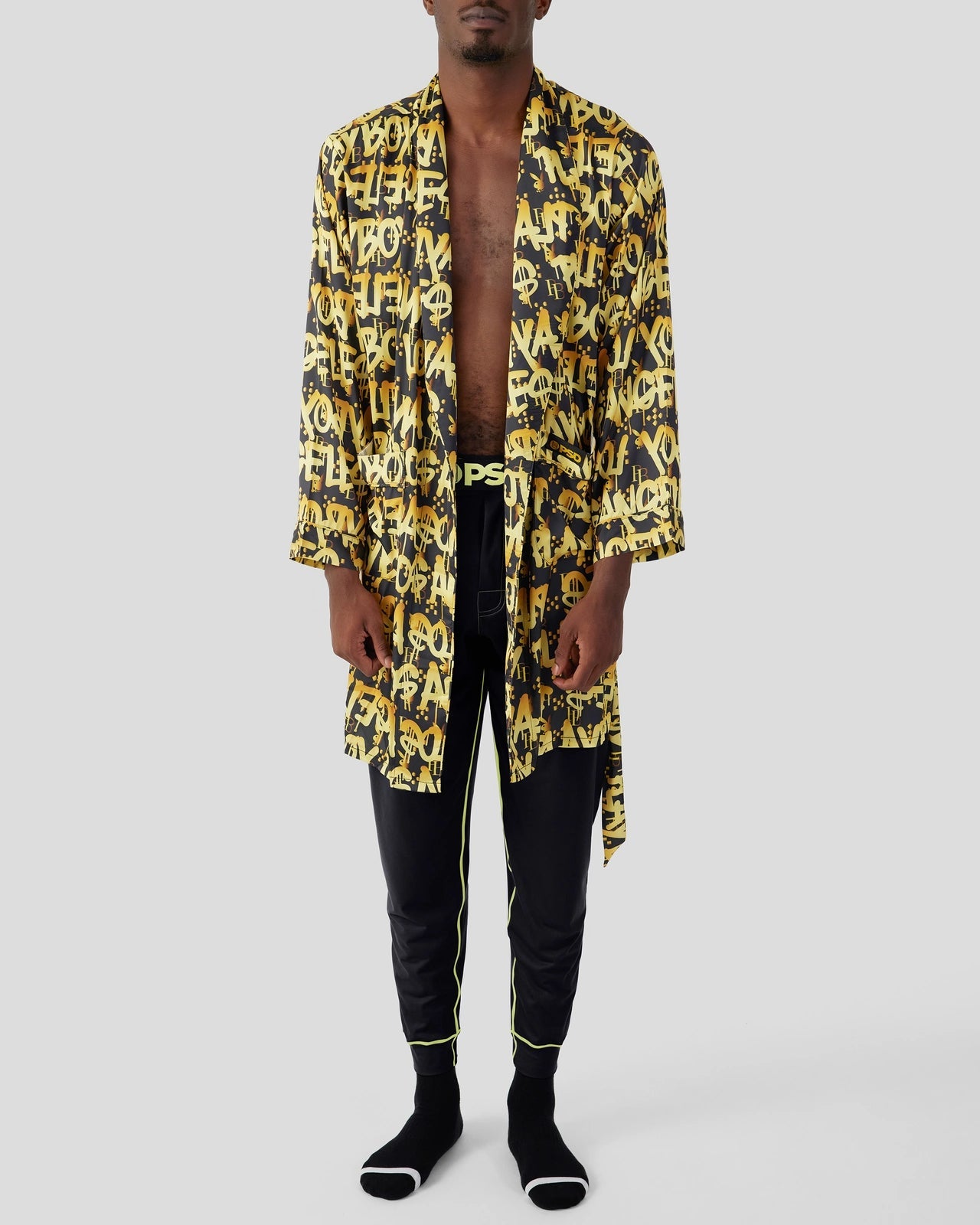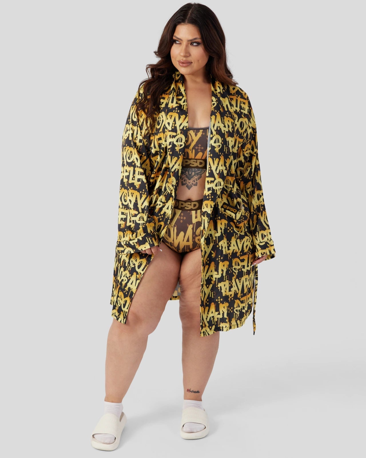 Feel like you???re lounging in luxury in our unisex Robe. Made of a satin-based, silky fabric, it features a classic silhouette with a shawl collar, adjustable or removable belt, and two front pockets.