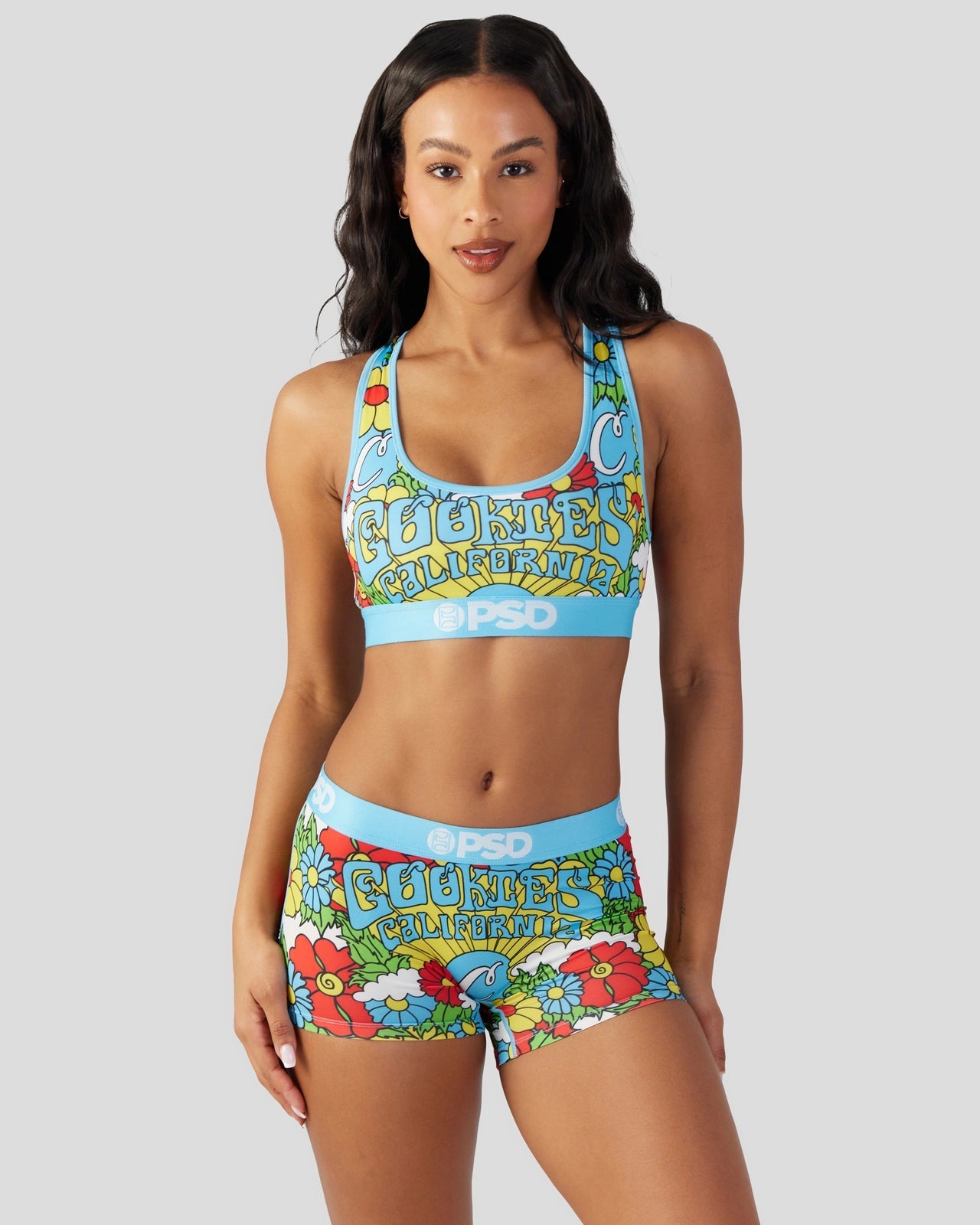 New from Cookies x PSD! With a colorful retro print, the Cali Cookies Sports Bra is made from a silky poly blend with a comfortable full coverage, keep-you-in fit. The PSD boy shorts are perfect for everyday wear and working out.