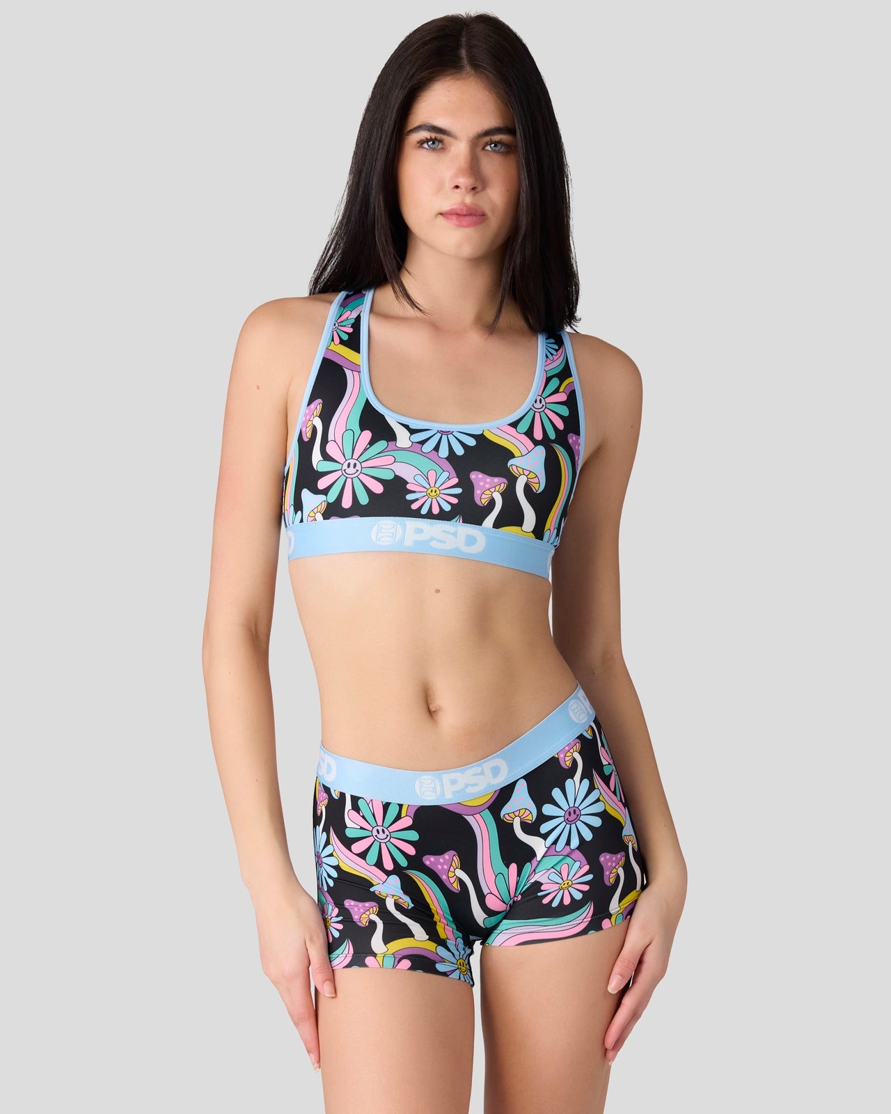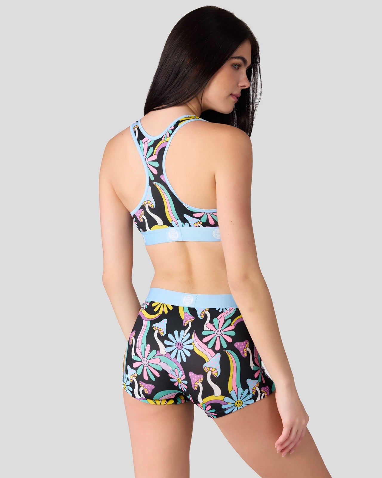 Ready to take a trip? The Happy Shrooms Sports Bra is made from a silky poly blend that???s breathable yet slightly compressive, bringing you the comfort and support you need for everything you get into.