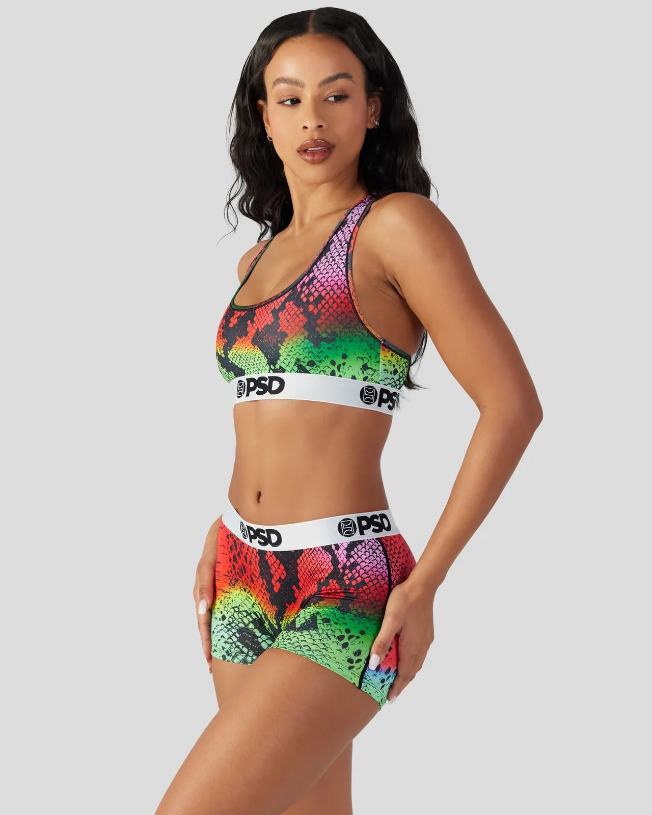 Don’t miss this new women???s color snakeskin-printed drop! The Infrared Snake Sports Bra is made from a silky poly blend with a comfortable full coverage, keep-you-in fit. The PSD boy shorts are perfect for everyday wear and working out.