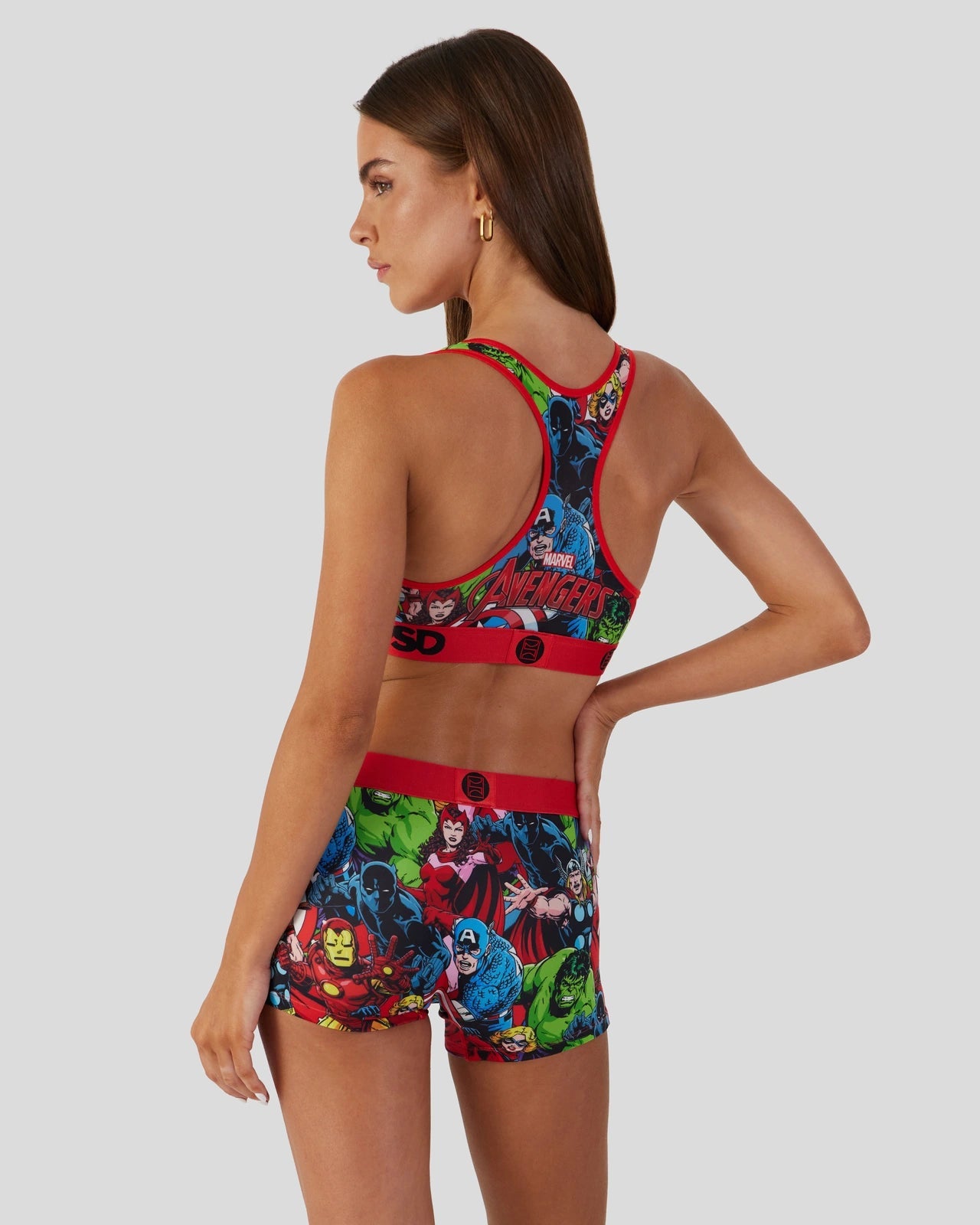 The Marvel – Avengers Sports Bra features members of the Avengers from the Marvel comics assembled in an all-over print that includes Captain America, Black Panther, Iron Man, Thor, Scarlet Witch, and Captain Marvel. Made with our silky poly blend, the Sports Bra is breathable yet slightly compressive, bringing you the comfort and support you need for everything you love to do in life.