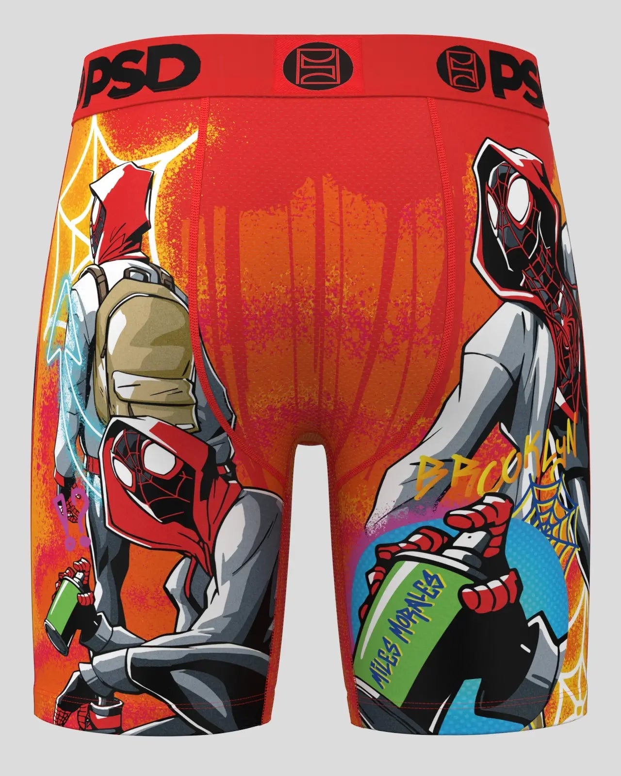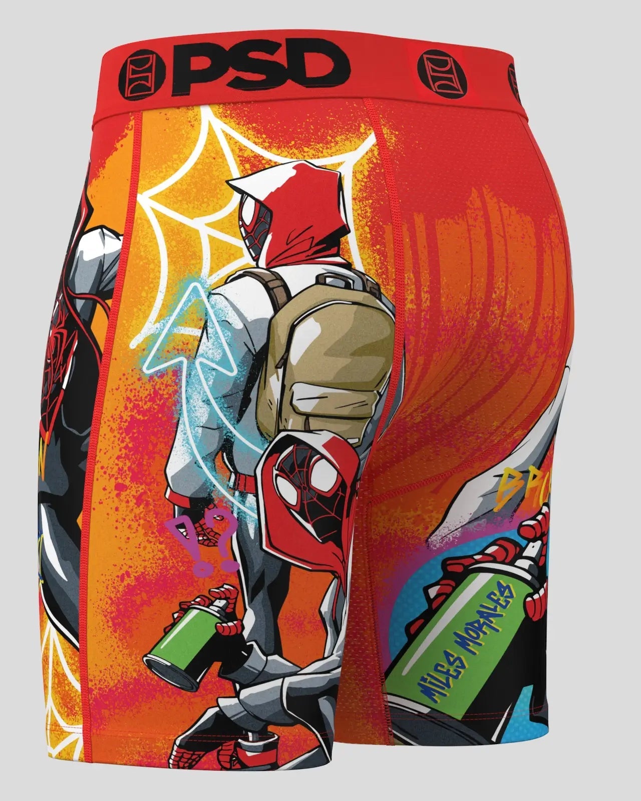 Don???t miss this new look featuring Brooklyn???s own webbed super hero. The Miles Morales Pop briefs include our ultra-comfortable Signature WaistBand, a breathable MicroMesh pouch, and four-way stretch. The PSD 7??? Standard Length Briefs won???t roll or ride and were built for everything, from everyday wear to your toughest workouts.